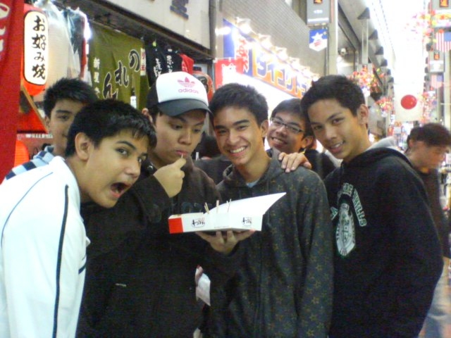 なんばグランド花月の前で、たこ焼きを買ってみんなで食べました。一番先にアツアツのたこ焼きを一口で食べた生徒は、熱すぎてボムったので、そこから教訓を得た他の生徒たちは、フーフーしたり、人指し指でつついたりしてから食べていました。