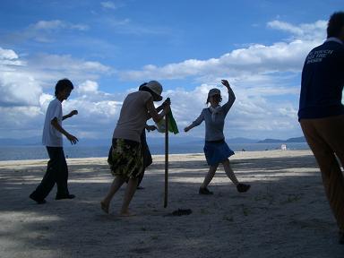 食事の後は、メインイベント的なテンションで行われた「ビーチバナナ」☆ご想像の通り、ビーチフラッグのバナナ版です。スタート前にバットの周りをぐるぐる回り、バナナをダッシュで奪取し、完食すれば勝ち!みんな日頃の人間関係の悩みを発散するかのような走りでした。